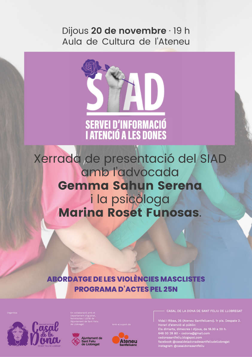 Organitza: Casal de la Dona i SIAD en col·laboració amb el Departament d’Igualtat, feminismes i LGTBI de l’Ajuntament de Sant Feliu de Llobregat