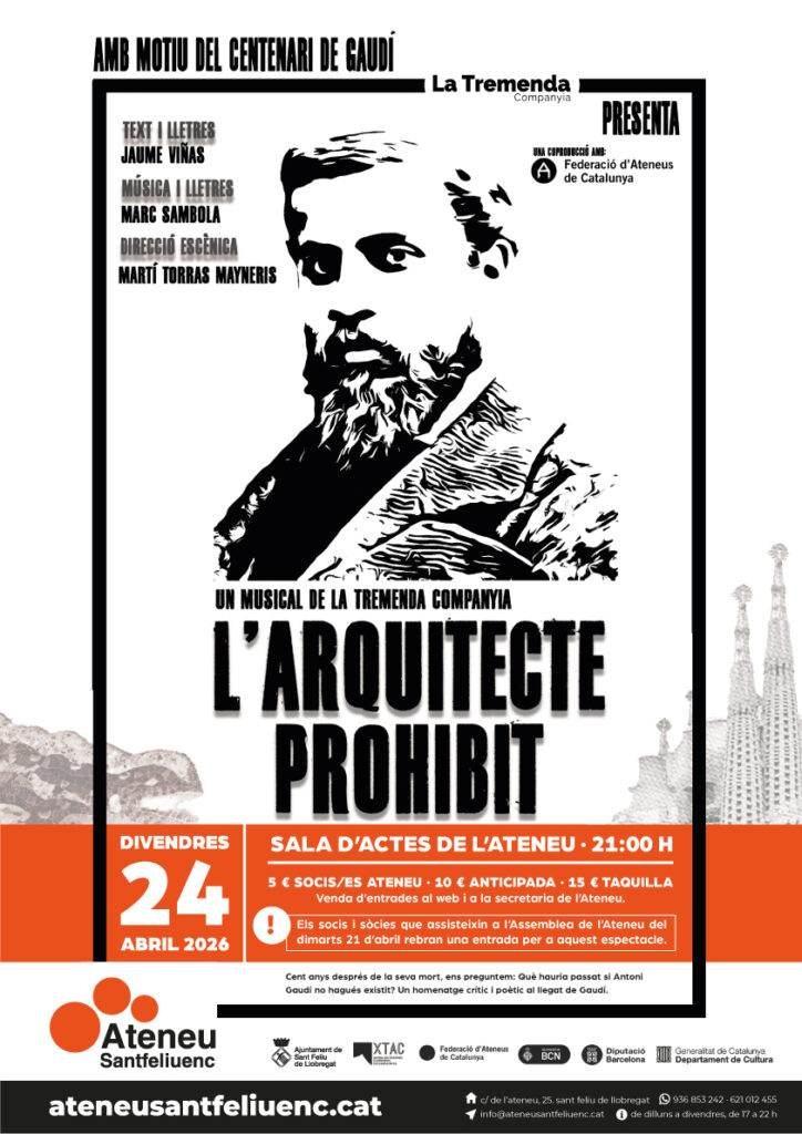 La companyia La Tremenda i la Federació d’Ateneus de Catalunya (FAC) presenten l’espectacle L’ARQUITECTE PROHIBIT, un musical de Jaume Viñas amb música i lletres de Marc Sambola que es representarà en 33 teatres d’ateneus. Dirigida per Martí Torras Mayneris i interpretada per Clàudia Abellán, Paula Amell, David Bonilla, Arnau Fà, Lu Martín, Abril Morera, Gerard Portolés, Queralt Sánchez i Alba Serrano, l’obra s’inspira en la figura d’Antoni Gaudí per commemorar el centenari de la seva mort, que es celebrarà aquest proper any 2026.
