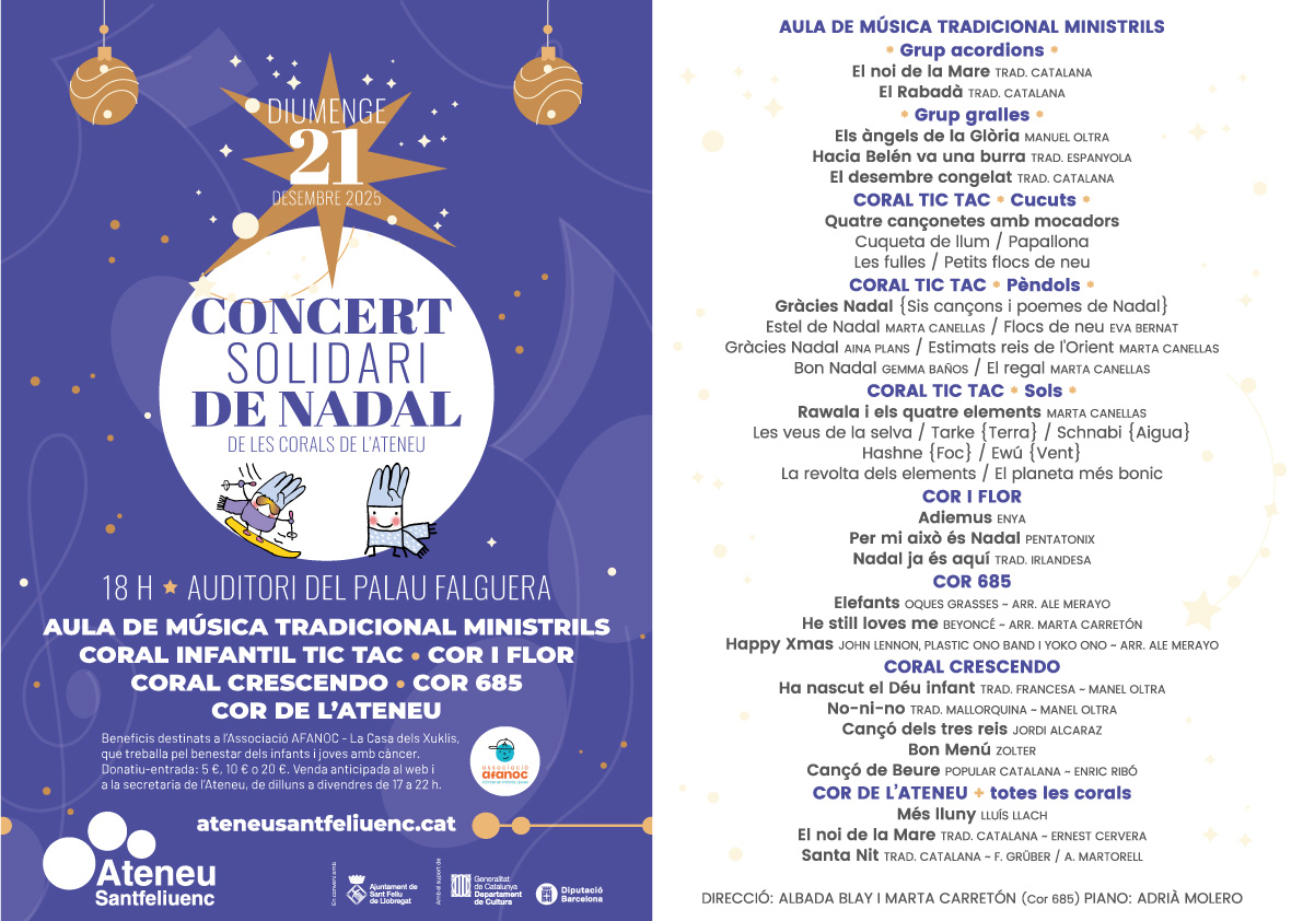 L’Ateneu Santfeliuenc convida la ciutadania a compartir una tarda de música, solidaritat i esperit nadalenc.
