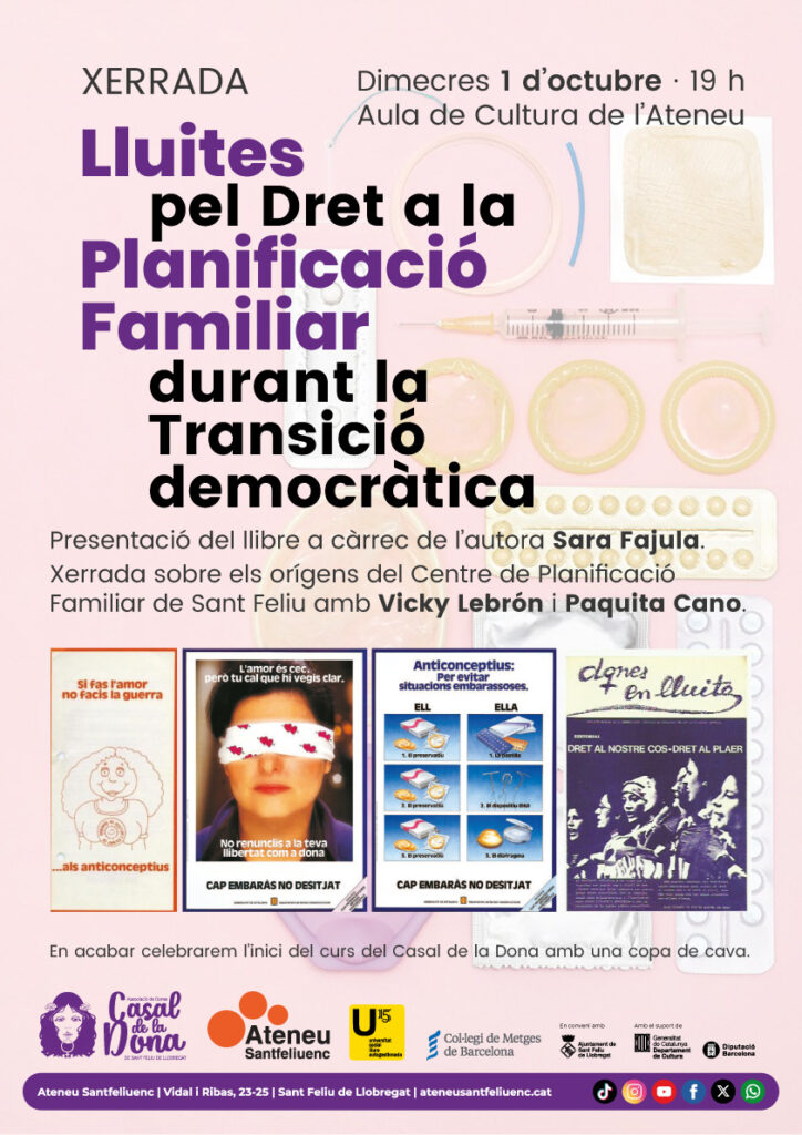 L’acte comptarà amb la participació de Sara Fajula, historiadora de la ciència i arxivera del Col·legi de Metges de Barcelona, que presentarà el seu llibre “El dret a la planificació familiar a Barcelona (1971-1985)”. També hi intervindran Vicki Lebron, metgessa, i Paquita Cano, representant de l’Associació de Veïns del Barri de la Salut, totes dues cofundadores del Centre de Planificació Familiar de Sant Feliu de Llobregat.