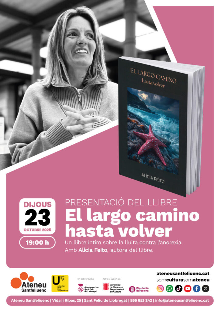 La santfeliuenca Alícia Feito presenta a l'Ateneu el seu llibre "El largo camino hasta volver". Un relat íntim sobre la lluita contra l'anorèxia, on l'autora ens convida a caminar. Un llibre honest, humà i fet des del cor: silenciós, disfressat de control, de perfecció, d'exigència.