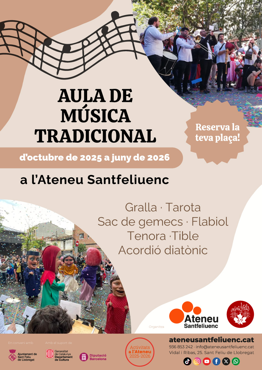 També aquest curs 2025-2026, Ministrils oferirà a l’Ateneu l’Aula de Música Tradicional, un espai per fomentar, preservar i difondre la música tradicional catalana i de les músiques d’arrel tradicional de Sant Feliu de Llobregat. Classes de gralla, flabiol, tamborí, tenora, tible, tarota, acordió diatònic i sac de gemecs, a càrrec de professors reconeguts i amb experiència dins la música d’arrel.