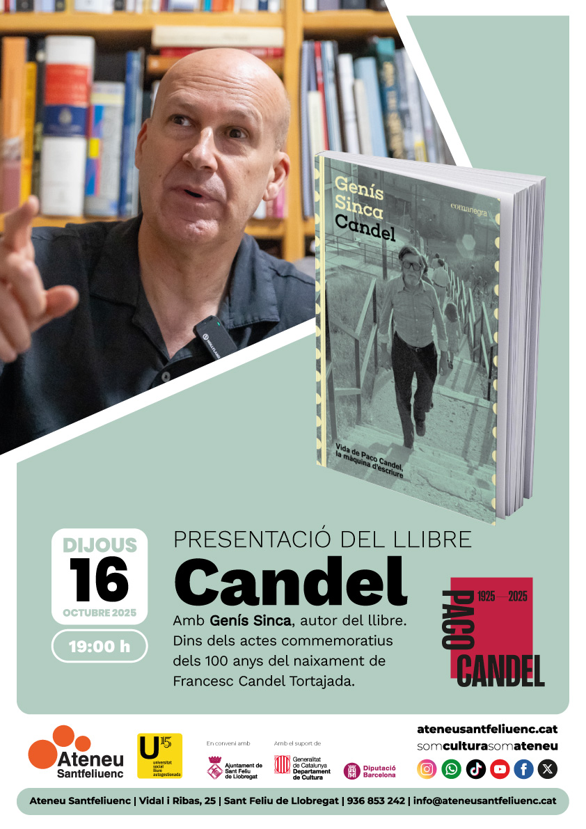Paco Candel: la millor medicina per a temps convulsos. Davant dels discursos d'odi contra el foraster i les dificultats per integrar noves cultures a la catalanitat, l'exemple de Candel encara ens marca el camí.El Govern de la Generalitat de Catalunya celebra l'any 2025 els 100 anys del naixement de Francesc Candel Tortajada, conegut com a Paco Candel amb l’objectiu de posar en relleu, recuperar i divulgar la seva memòria. En el marc d'aquesta commemoració la USLA de l'Ateneu Santfeliuenc organitza la presentació del llibre "Candel", de Genís Sinca, el dijous 16 d'octubre, a les 19 h, a l'Aula de Cultura de l'Ateneu. La millor obra de Paco Candel és la seva vida. Més enllà de l’èxit esclatant de les seves obres, que el van arribar a convertir en l’autor més venut de Sant Jordi i un dels més llegits a Espanya —parlant d’un barri que poca gent trepitjava i d’on ell no va voler marxar mai—; més enllà d’això i de tots els reconeixements per una carrera literària extraordinària, podem dir que l’obra principal de Candel és la seva pròpia vida. Una vida que encara ens serveix com a model de compromís i com a guia per interpretar el nostre temps. Quan Genís Sinca va entrar per primera vegada a casa de Candel, era un jove periodista fascinat pel mite del barraquisme català, la veu dels «altres catalans», i hi va conèixer la persona, amb tota la profunditat. Van passar set anys de converses, els últims anys de la vida de l’autor, trenats per la lectura profunda de l’obra candeliana i moltes entrevistes amb persones del seu entorn, fins que aquest llibre va començar a prendre forma. Som davant de la primera i única biografia de Paco Candel, i també de les seves últimes memòries. «Va representar la incorporació del xarnego a l’hora de jutjar aquelles zones on Barcelona i Catalunya perdien el nom. Candel és un escriptor extremadament singular, però també excel·lent, perquè la seva vida representa la reconstrucció de la Barcelona democràtica» —Manuel Vázquez Montalbán Genís Sinca (Manresa, 1970) és periodista i escriptor. Llicenciat en Ciències de la Informació (UAB), abans de dedicar-se a la literatura es va guanyar la vida com a model publicitari i venedor d’apartaments d’estiueig. Avui és un dels millors divulgadors culturals del país. A més de la de Paco Candel, és autor de les biografies d’Heribert Barrera, J. B. Cendrós i Eduard Punset, i d’un recull de peces biogràfiques de gran èxit, Honorables catalans. Ha col·laborat molts anys a RAC1 i TV3 fent perfils d’importants figures catalanes, va treballar de corresponsal a Itàlia per a premsa i ràdio i el 2013 va guanyar el Premi Josep Pla amb Una família exemplar. És el comissari de l’Any Candel, que commemora el centenari del naixement de l’autor.