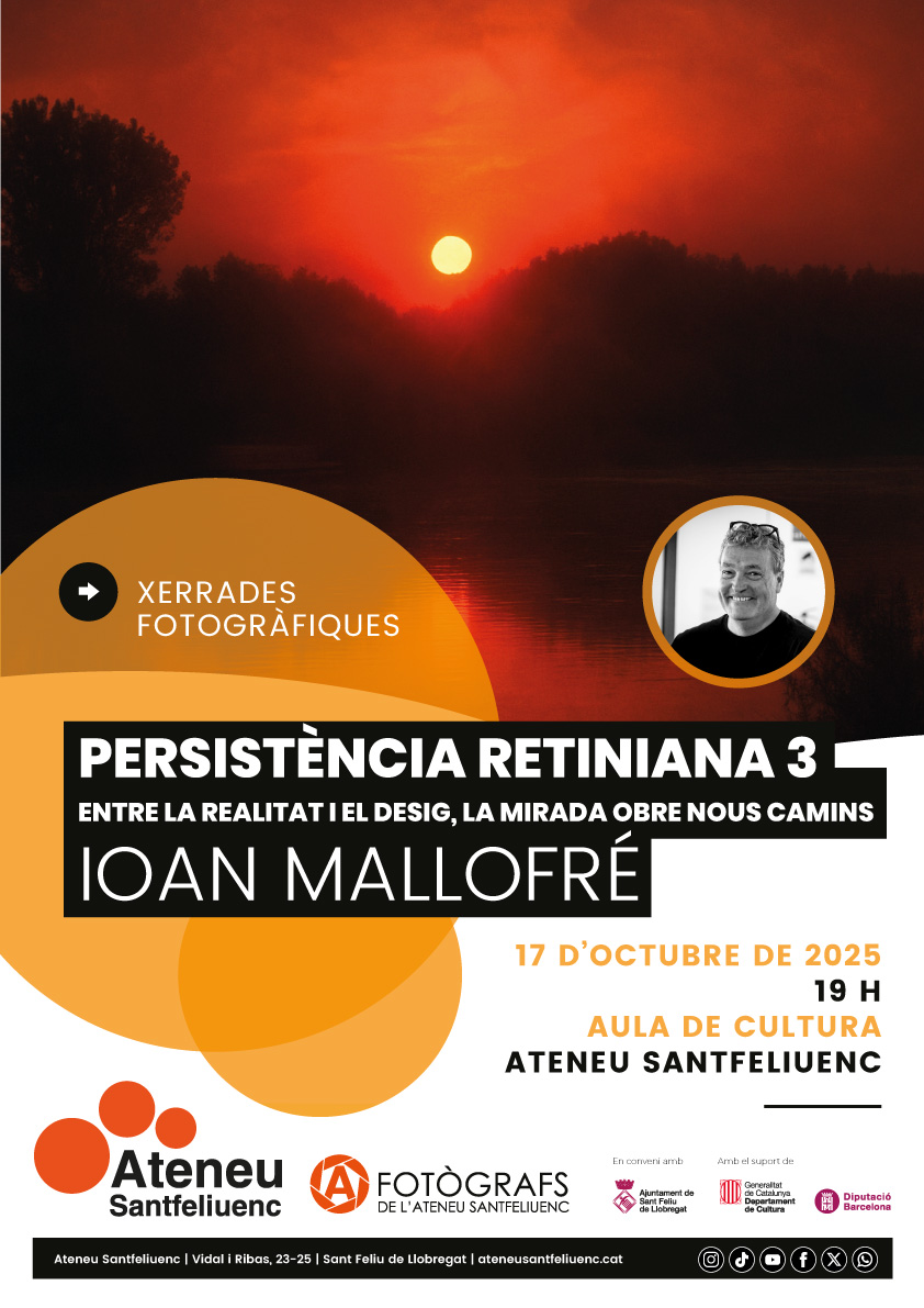Sota el títol "Persistència retiniana 3", en Ioan ens parlarà de com la mirada obre nous camins entre la realitat i el desig. Una xerrada fotogràfica sobre la mirada i les seves possibilitats, perquè entre el que som i el que volem ser, entre el que mirem i el que veiem, hi ha l’espai on neix una mirada nova. La fotografia ens convida a habitar aquest espai: a aturar-nos, observar i descobrir que el fet quotidià pot revelar el que encara no havíem vist. "Som el que fem cada dia, però també el que desitgem arribar a ser. Mirem el que tenim davant, però també allò que voldríem veure." I és en aquest diàleg, entre realitat i desig, on s'obre el camí creatiu: allà on la vida aixeca un mur, la intel·ligència i la sensibilitat troben una sortida. Aquesta serà la 30a xerrada fotogràfica organitzada per Fotògrafs de l'Ateneu i la 3a impartida pel Ioan Mallofré, alma mater de la secció que va sorgir arran de l'interès dels participants en els tallers de fotografia i que s'ha consolidat a través dels seus 10 anys d'història com una comunitat de persones amants de la fotografia que generen activitats des de l'Ateneu per a tota la ciutadania.