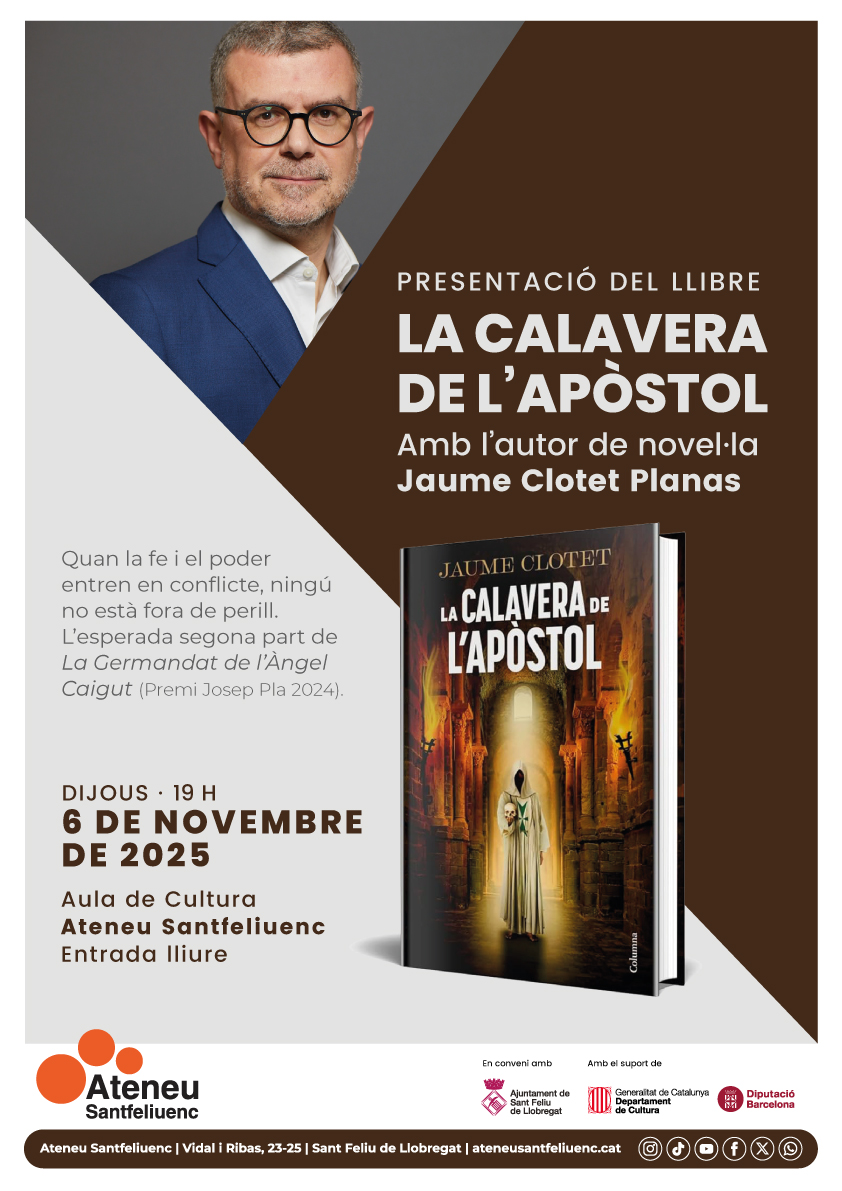 Jaume Clotet Planas torna a l'Ateneu el dijous 6 de novembre, a les 19 h, per a presentar el seu darrer llibre: La calavera de l'apòstol.