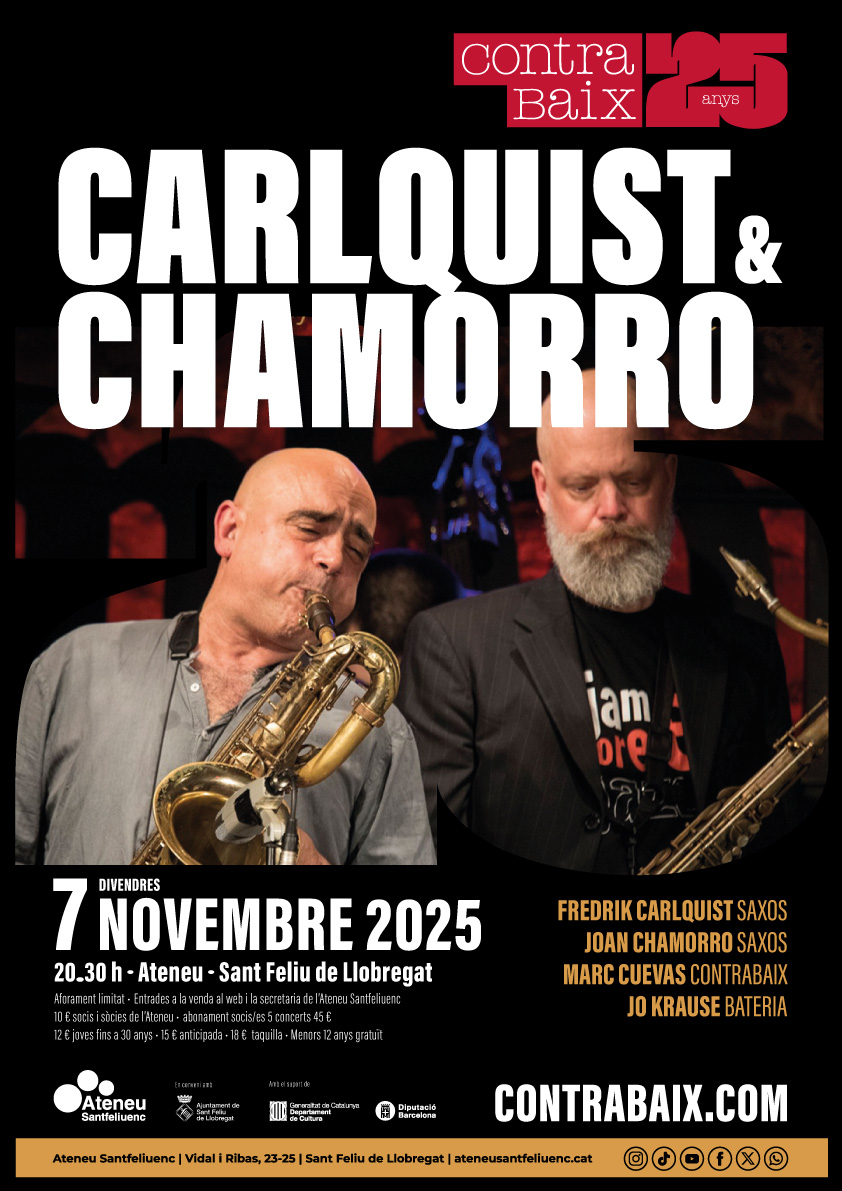 ContraBaix reprèn la programació després de les vacances del mes d’agost amb dotze concerts de setembre a desembre. En una temporada d'èxits fins el mes de juliol i amb només els dies d'agost de descans, el 26 de setembre torna el cicle ContraBaix amb nous projectes de música de gran qualitat i amb la participació de grups internacionals. TONIA RICHII & Co. Divendres 26 de setembre · Ateneu · Sant Feliu de Llobregat BRATIA (gira XTAC-FAC) Dissabte 26 de setembre · Ateneu Igualadí · Igualada MIQUEL BARCELÓ QUARTET Dissabte 27 de setembre · Ateneu · Sant Just Desvern BRATIA (gira XTAC-FAC) Dissabte 27 de setembre · Aliança Palmarenca · La Palma de Cervelló BOOGALIZER Diumenge 28 de setembre · Teatre Plaza · Castelldefels THE BIG EASY’S CREW FT. JONATHAN HERRERO Divendres 19 d’octubre · Ateneu · Sant Just Desvern VÍCTOR DE DIEGO ORGANIC QUARTET Divendres 24 d’octubre · Ateneu · Sant Feliu de Llobregat BRATIA (gira XTAC-FAC) Divendres 31 d’octubre · El Casal de Llavaneres · Sant Andreu de Llavaneres F. CARLQUIST – J. CHAMORRO Divendres 7 de novembre · Ateneu · Sant Feliu de Llobregat BRATIA (gira XTAC-FAC) Dissabte 22 de novembre · La Cate · Figueres SUNSCAPE Divendres 12 de desembre · Ateneu · Sant Feliu de Llobregat BRATIA (gira XTAC-FAC) Dissabte 20 de desembre · Casino de Calaf · Calaf Consulta tots els detalls i compra les teves entrades al web de ContraBaix. El cicle ContraBaix continua celebrant el seu 25è aniversari amb una programació que aposta per la música de qualitat, la cultura i els grans músics que han fet i continuen fent història als nostres escenaris. Us esperem als pròxims concerts, en aquest punt de trobada per als amants de la bona música, una aposta per artistes de primer nivell i la millor manera de fer cultura des del territori. Després de 25 anys d’història, continuem amb la mateixa il·lusió d’omplir sales, emocionar el públic i oferir experiències úniques. Vine, celebra i viu ContraBaix.
