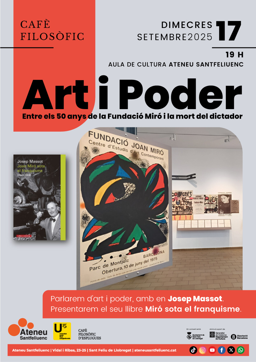 El dimecres 17 de setembre tornen els Cafès Filosòfics a l’Ateneu Santfeliuenc. A partir de les 19 hores, l’Aula de Cultura de l’Ateneu acollirà una nova xerrada de la USLA de l’Ateneu i el Cafè Filosòfic d’Esplugues, en aquesta ocasió sobre art i poder amb Josep Massot i la presentació del seu llibre “Miró sota el franquisme”.