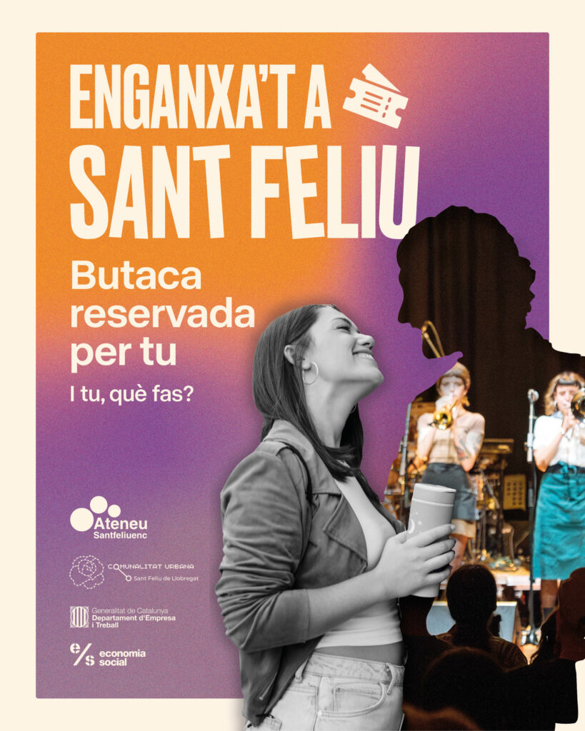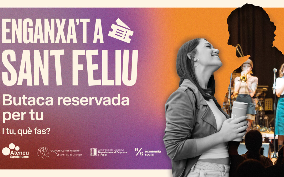 Amb el lema “Enganxa’t de Sant Feliu” instem a la ciutadania a participar de les activitats culturals de la ciutat com el cinema, el teatre i la música en directe. Perquè consumir cultura és construir comunitat. Perquè a Sant Feliu, cada entrada és un vot per una agenda cultural viva i accessible. I no cal marxar de la teva ciutat per gaudir d’espectacles de la millor qualitat!